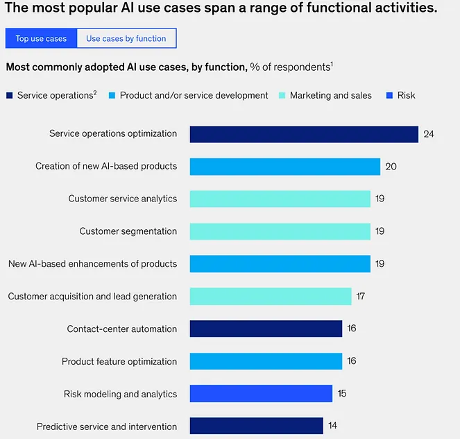 Around a quarter of the Members of Boardwave, the European networking community for Software Founders & CEOs, are already using AI within their products and using the technology as a differentiator. For many the technology is "under the covers" to improve their solutions breadth or accuracy - so not necessarily exposed to the user. This may be a quiet revolution, as it seems there may be a creeping industrialisation of AI, stealth-like invasion of our software solutions and the businesses that use them. Take this graph, from McKinsey's report “The State of AI in 2022”, it shows the types of investments businesses are already making in AI technologies, and the current levels of industrialisation of this new technology