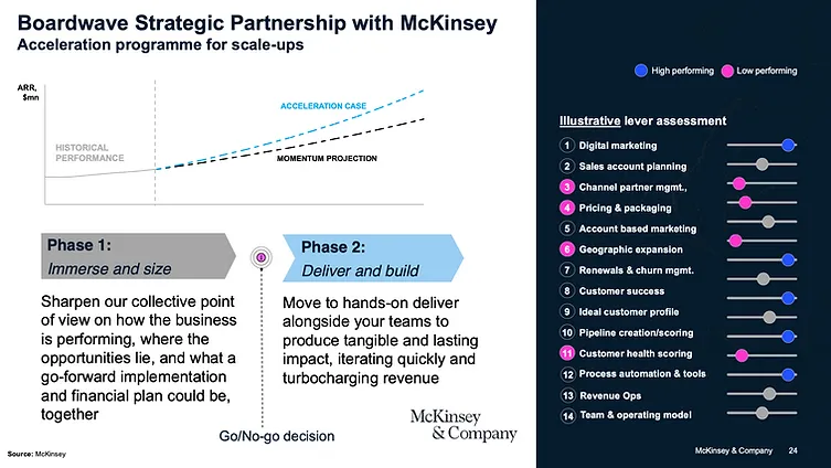 A key addition to our Accelerate Programme is the strategic partnership with McKinsey. This partnership brings a powerful new diagnostic tool to the table for companies with a £10-50 million ARR, and is designed to help identify the specific areas where members can accelerate business growth. McKinsey will conduct a comprehensive assessment of your business, looking at leadership, growth strategies, and operational efficiency.